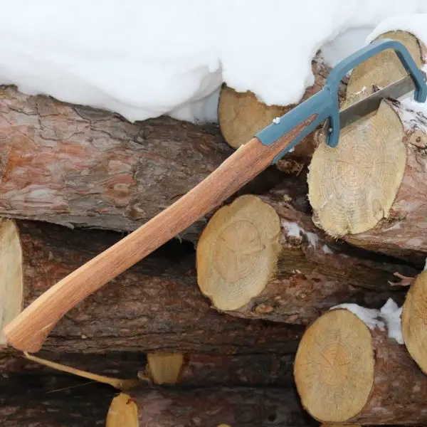 The 7″ replaceable blade has 5 1/2″ exposed for cutting. It cuts faster with less fatigue than an ordinary axe because it weighs only about 2 lb, including the handle, and because its balance makes it ideal to use one handed while holding brush aside.